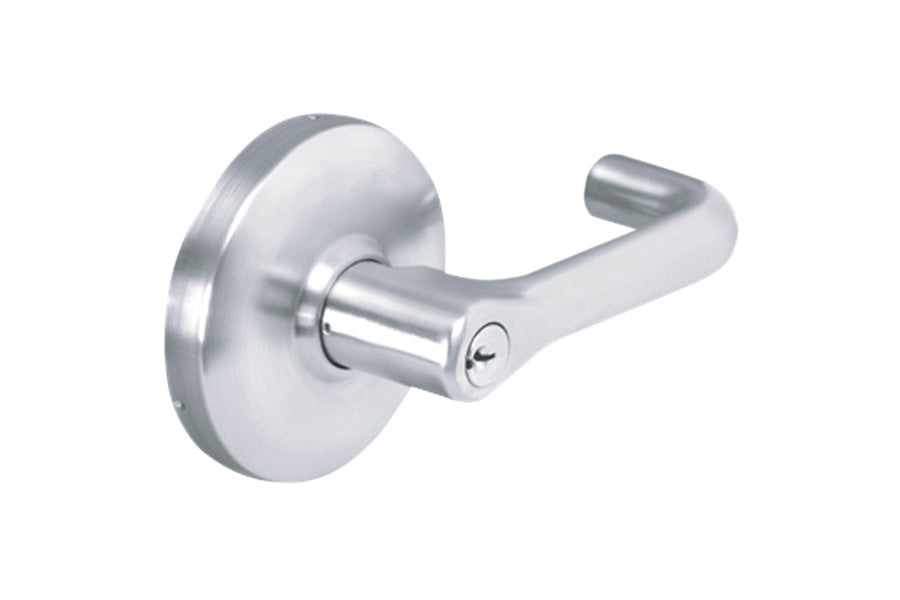 - ANSI Function 09 - Storeroom, key operates lever, otherwise always locked. Storeroom Lever Exit Device Trim in Aluminum is an accessory for an Exit Device. Entry by turning key, key does not unlock exit device. Key unlatches the exit device when turned so you can open the door from the outside.